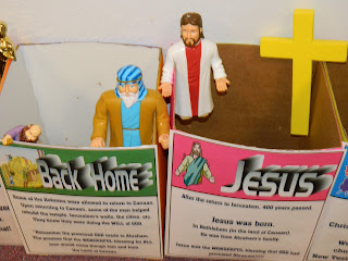 I LABELED each box with one of my "GOD'S AWESOME PLAN FOR MAN" posters. I then began filling each box with TEACHABLE TOYS....Toys that would help the KIDDOS REMEMBER what BIBLE EVENTS happen during which TIME PERIOD of the BIBLE!!